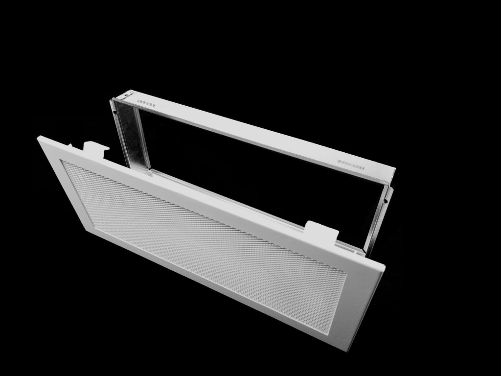 Montážní rámeček Součástí mřížky je inovativní montážní rámeček (zděř), který se snadno zabuduje do stavebního otvoru. Pomoci rozpěrných pracek se následně mřížka bezproblémově nacvakne do rámečku. Díky osazovacímu rámečku (zděři), který se pevně přilepí do stavebního otvoru pomocí kvalitního kamnařského tmelu nebo po případě přišroubuje vruty, mřížku lze jednoduše vyjmout a znovu nacvaknout. Tato flexibilita usnadňuje údržbu a čištění. Hloubka mřížky je 4 cm.