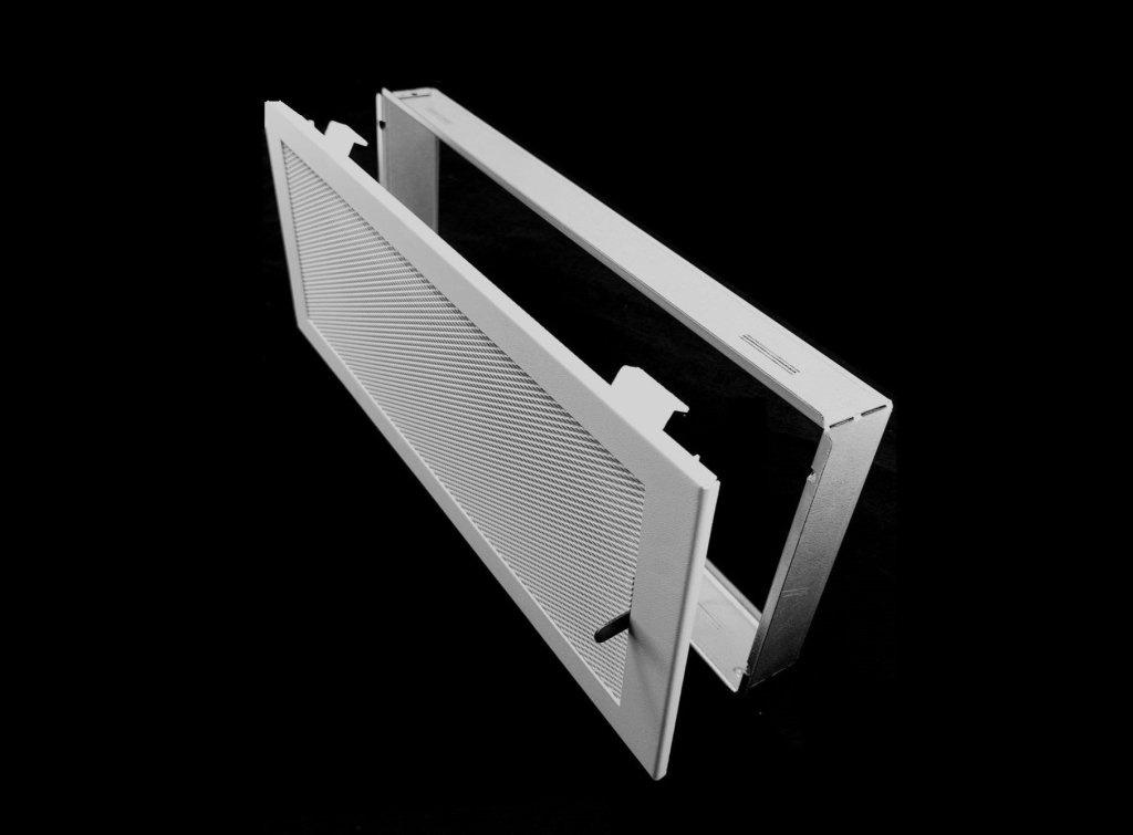 Montážní rámeček Součástí mřížky je inovativní montážní rámeček (zděř), který se snadno zabuduje do stavebního otvoru. Pomoci rozpěrných pracek se následně mřížka bezproblémově nacvakne do rámečku. Díky osazovacímu rámečku (zděři), který se pevně přilepí do stavebního otvoru pomocí kvalitního kamnařského tmelu nebo po případě přišroubuje vruty, mřížku lze jednoduše vyjmout a znovu nacvaknout. Tato flexibilita usnadňuje údržbu a čištění.